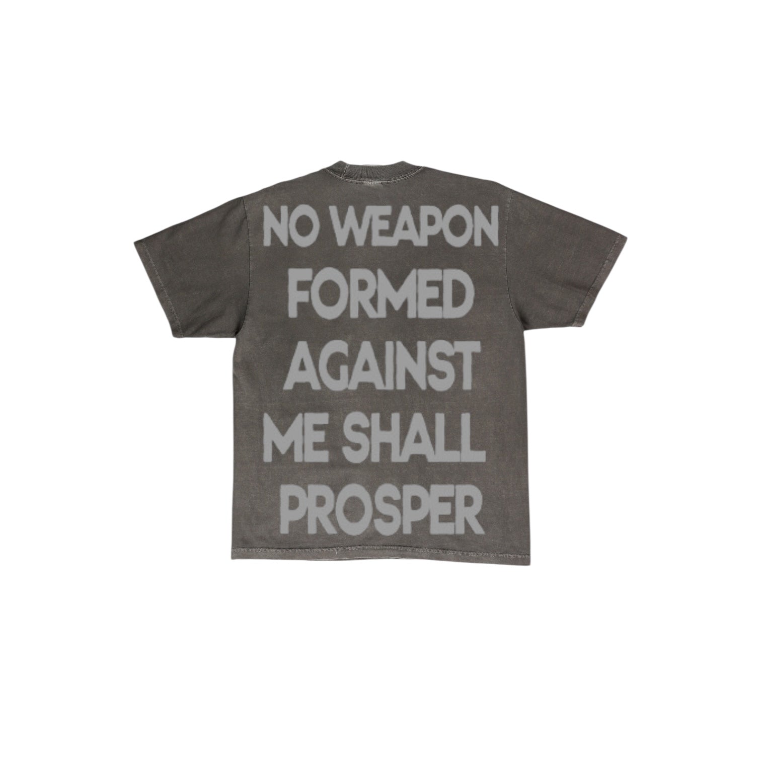 "NO WEAPON FORMED AGAINST ME SHALL PROSPER" 3M Reflective quote on back of shirt.